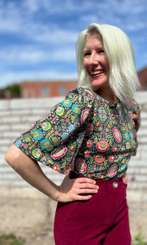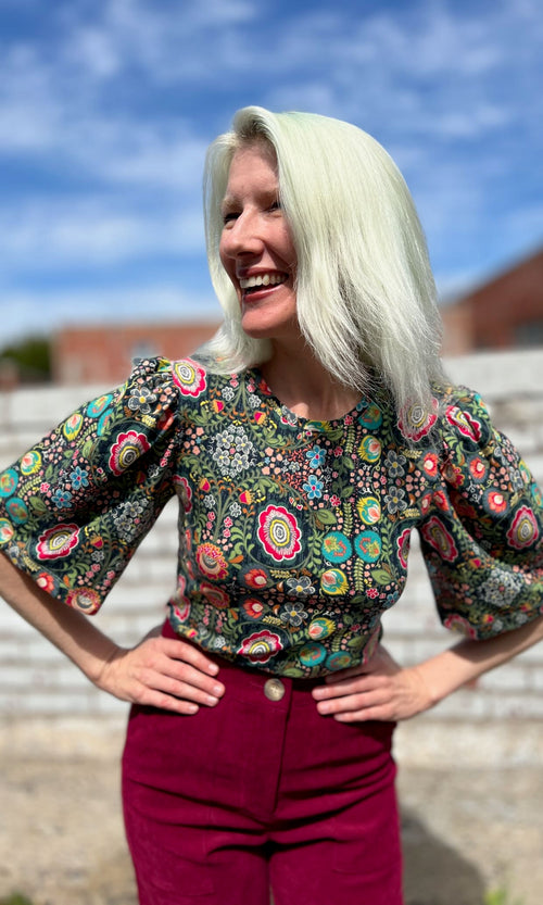 Peahen est un haut en coton à col ras du cou avec des manches longues jusqu'aux coudes et froncées aux épaules. Le haut Peahen est très extensible.