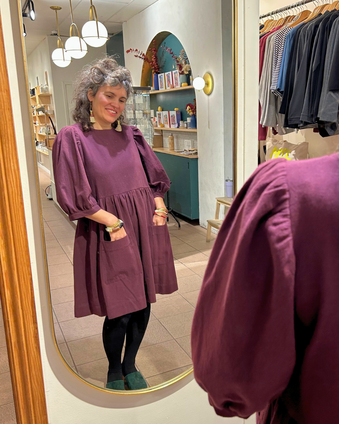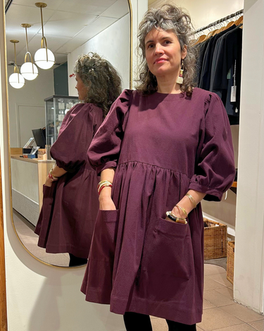 Flowerpiercer est une robe à la coupe décontractée, confectionnée en coton épais et texturé 100 %. Elle possède des poches latérales et des manches longues resserrées aux poignets. Elle s'enfile par la tête et se ferme par un bouton et une bride à l'arrière du cou.