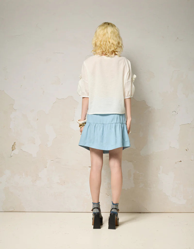 Haut à manches 3/4 resserrées au bas par un élastique, agrémenté d’un nœud décoratif délicat sur la manche. Il se distingue par une subtile découpe en forme de cœur à l’avant, qui apporte une touche féminine et originale. Une pièce idéale pour le printemps, à la fois légère et raffinée.