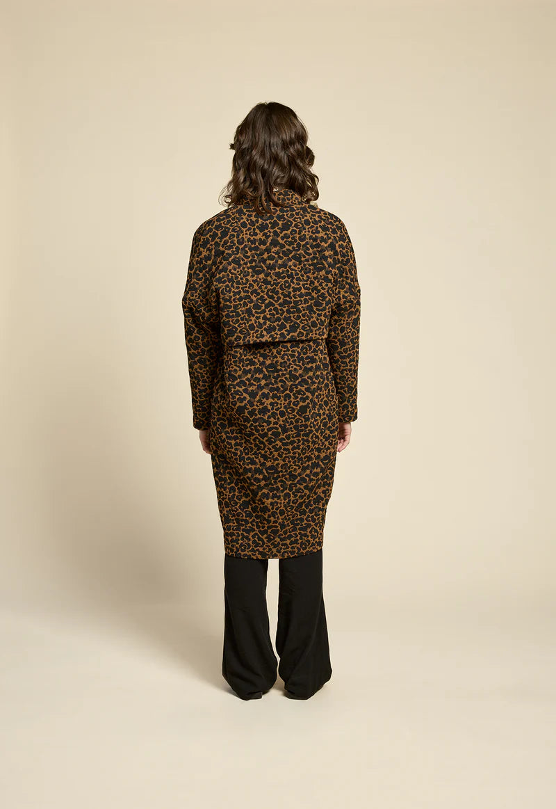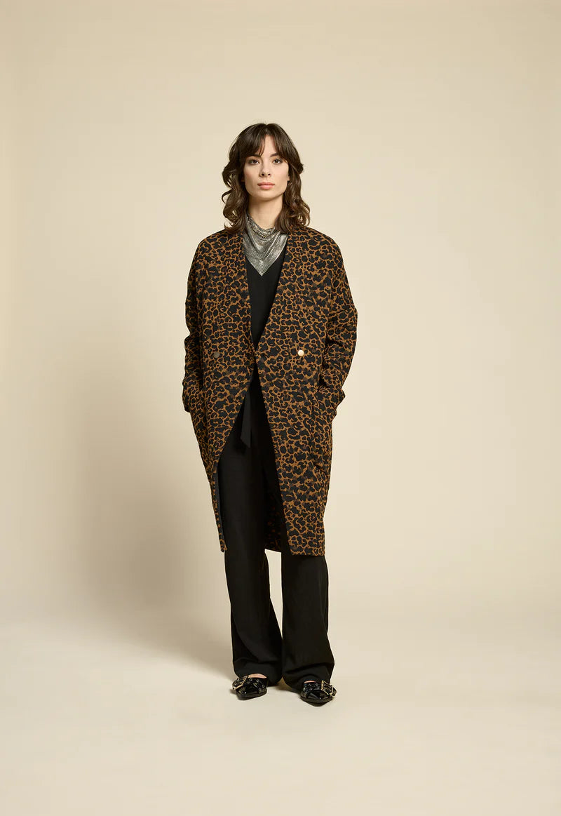 Longue veste dans un tissu à motif léopard. Elle sera parfaite pour l'automne. Pratique avec ses deux grandes poches, elle a aussi un joli détail de bouton en métal qui ajoutent un petit plus à son style. Un jolie morceau à ajouter à votre garde de robe.