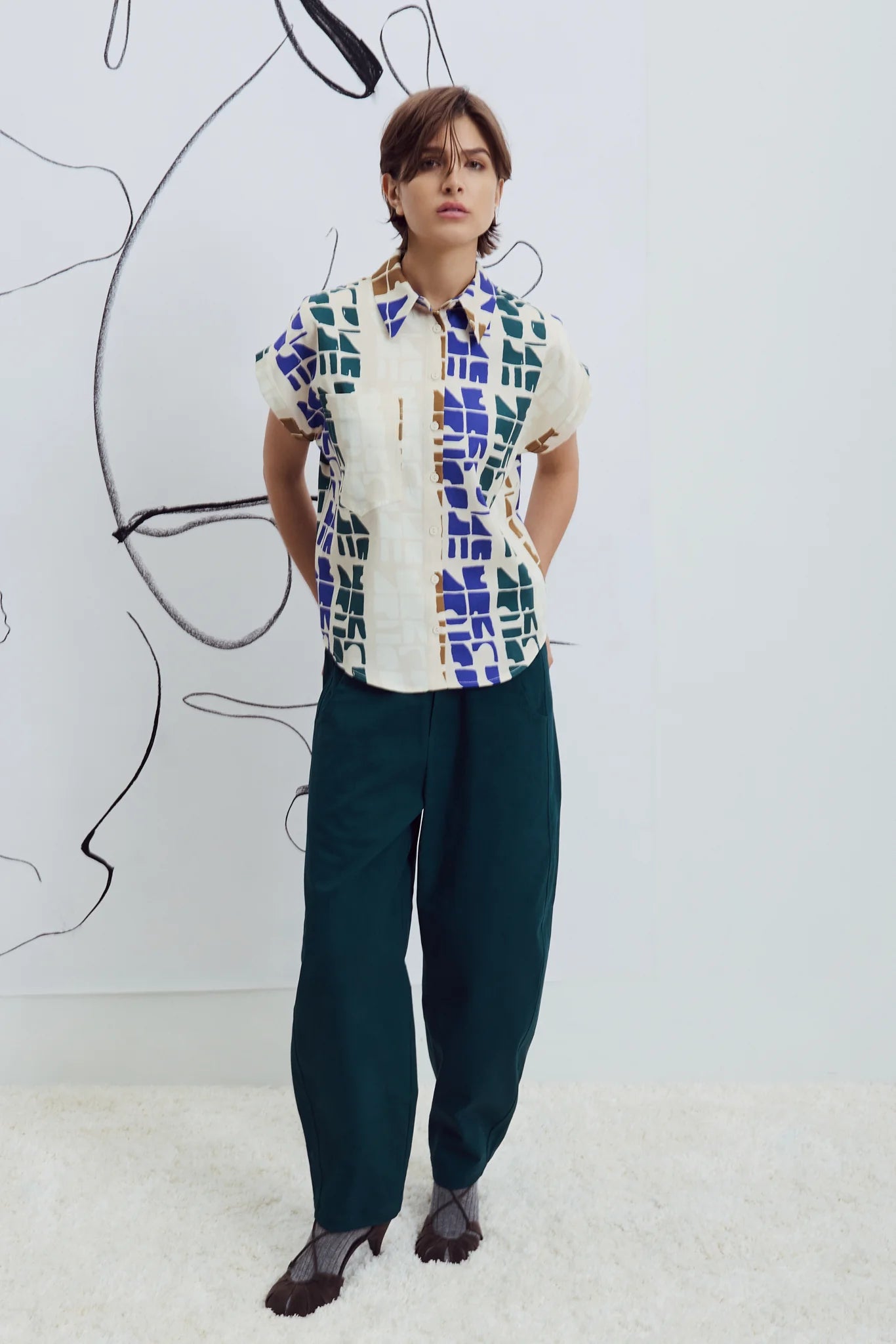 La chemise emblématique Eve Gravel ample et à manches courtes avec une poche plaquée poitrine côté droit. Parfaite à porter avec un col roulé en hiver ou ouverte sur une bralette lors des journées ensoleillées d’automne. Imprimé créé dans notre atelier.