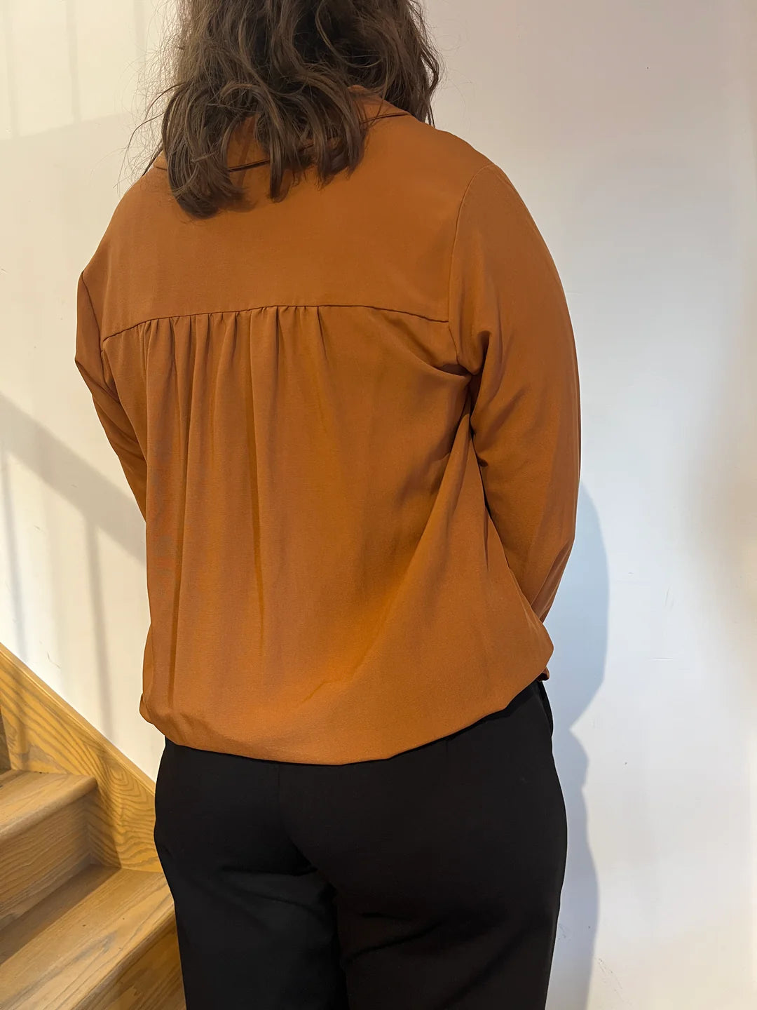 Le chemisier qui s'agence avec tout! Son encolure est plus féminine et légère que les chemisiers traditionnels. Nous avons opté pour un twill fluide qui lui donne du corps tout en bougeant bien. Les boutons couleur 'antique' lui donne un accent rétro.
