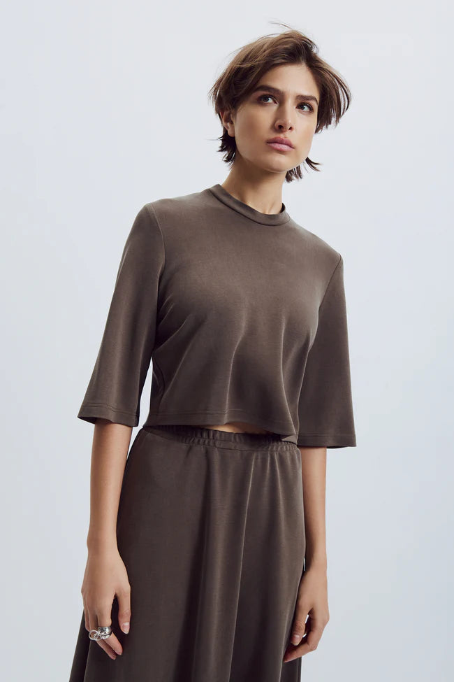 Haut à manches 3/4 amples et col légèrement montant conçu dans un tissu d'une qualité inégalée au velours doux et incomparable. Si tu cherches un basique plus épais et raffiné que nos modèles habituels celui-ci est fait pour toi. Il allie confort et élégance parfait pour apporter une touche de sophistication à ton quotidien.