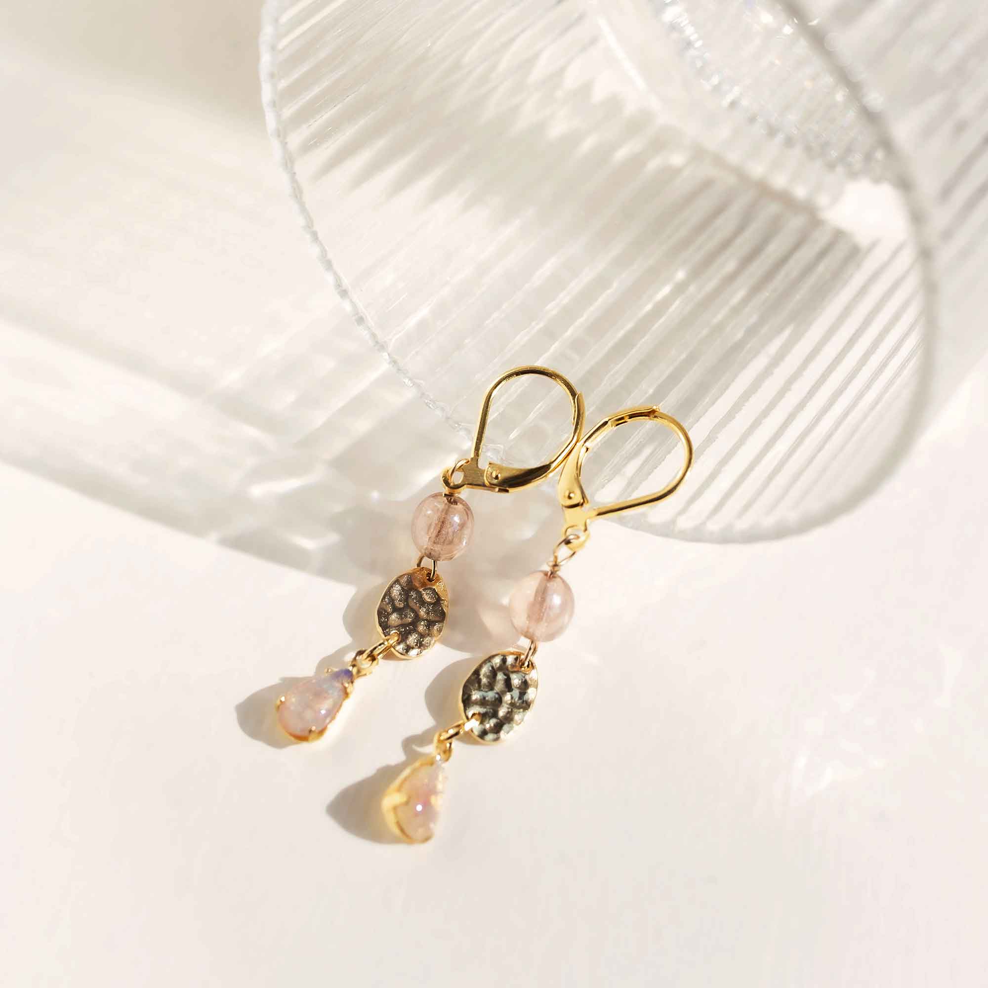 Boucles d'oreilles pendantes en laiton plaqué or de haute qualité, ornées de perles de verre aurore boréale et de cabochons en verre vintage rose arlequin. Fermoirs à levier pour un confort optimal. Plaqué or sur laiton (anti-ternissement).
