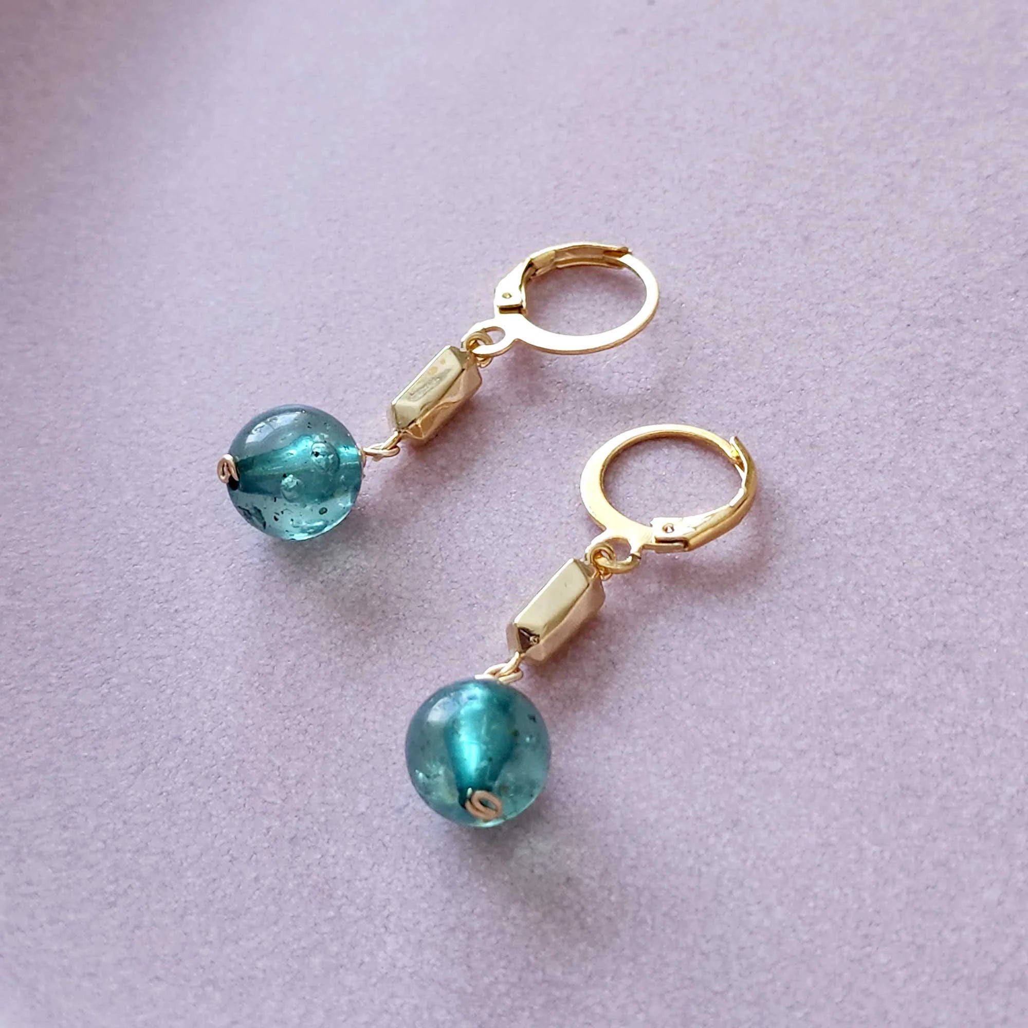 Magnifiques boucles d'oreilles pendantes composées de maillons plaqués or de haute qualité et de perles de lucite mouchetées bleu sarcelle au style vintage. Montées sur des crochets d'oreilles confortables, plaqués or.