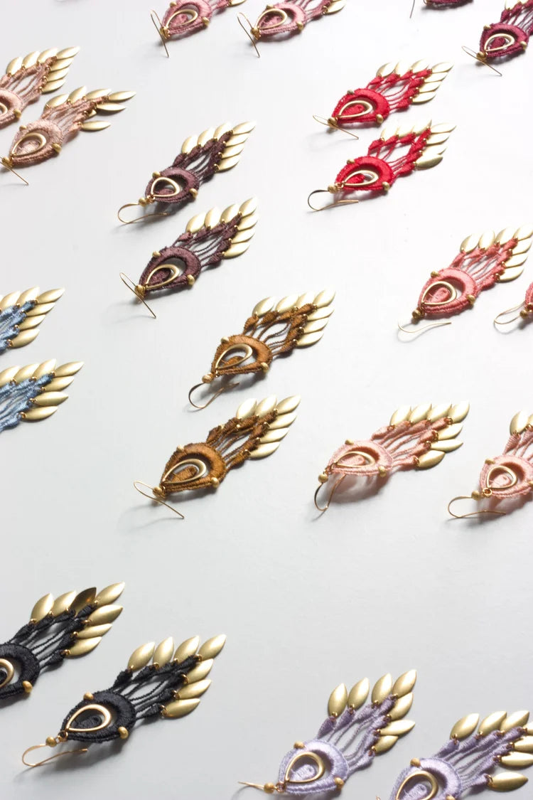 Ils sont composés de dentelle guipure douce teinte à la main et d'un mélange de composants métalliques en laiton brut. Disponible dans notre palette de couleurs mélangées à la main.