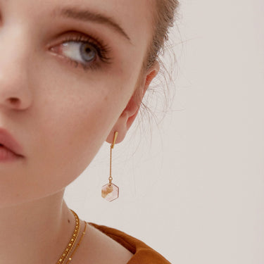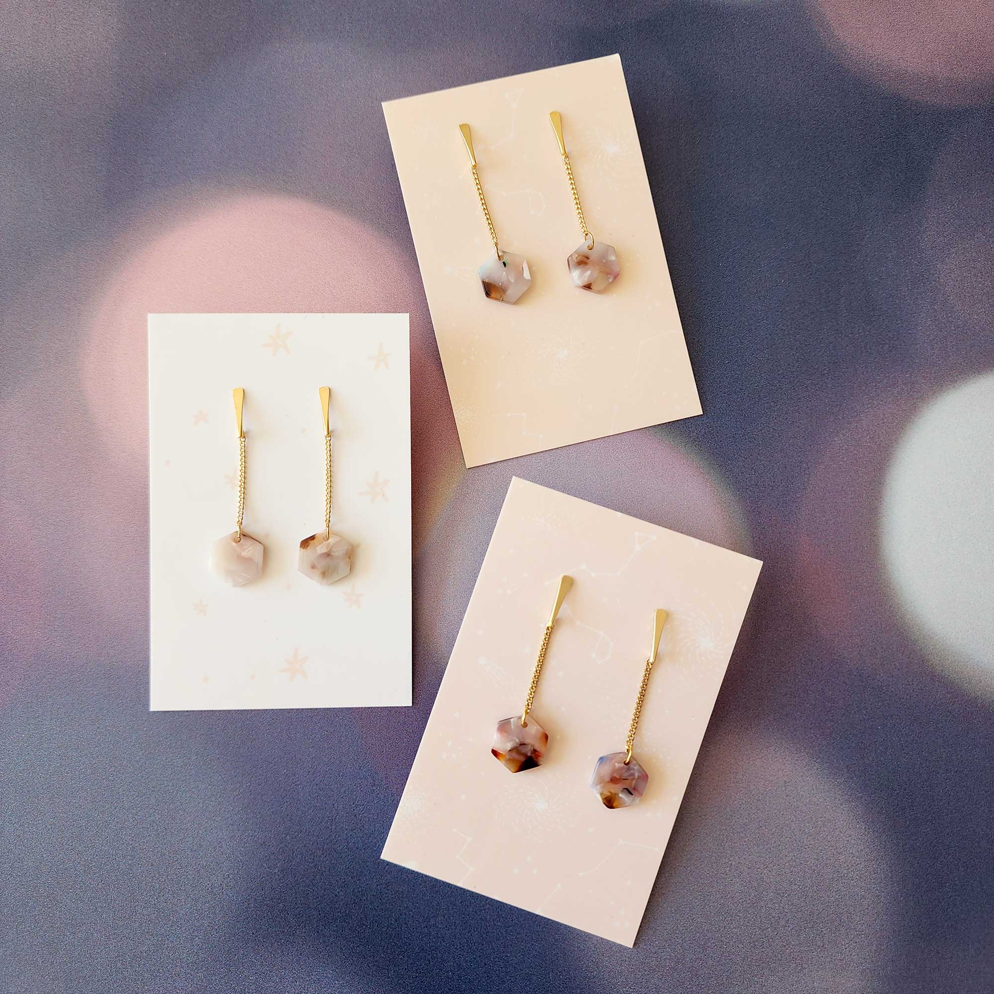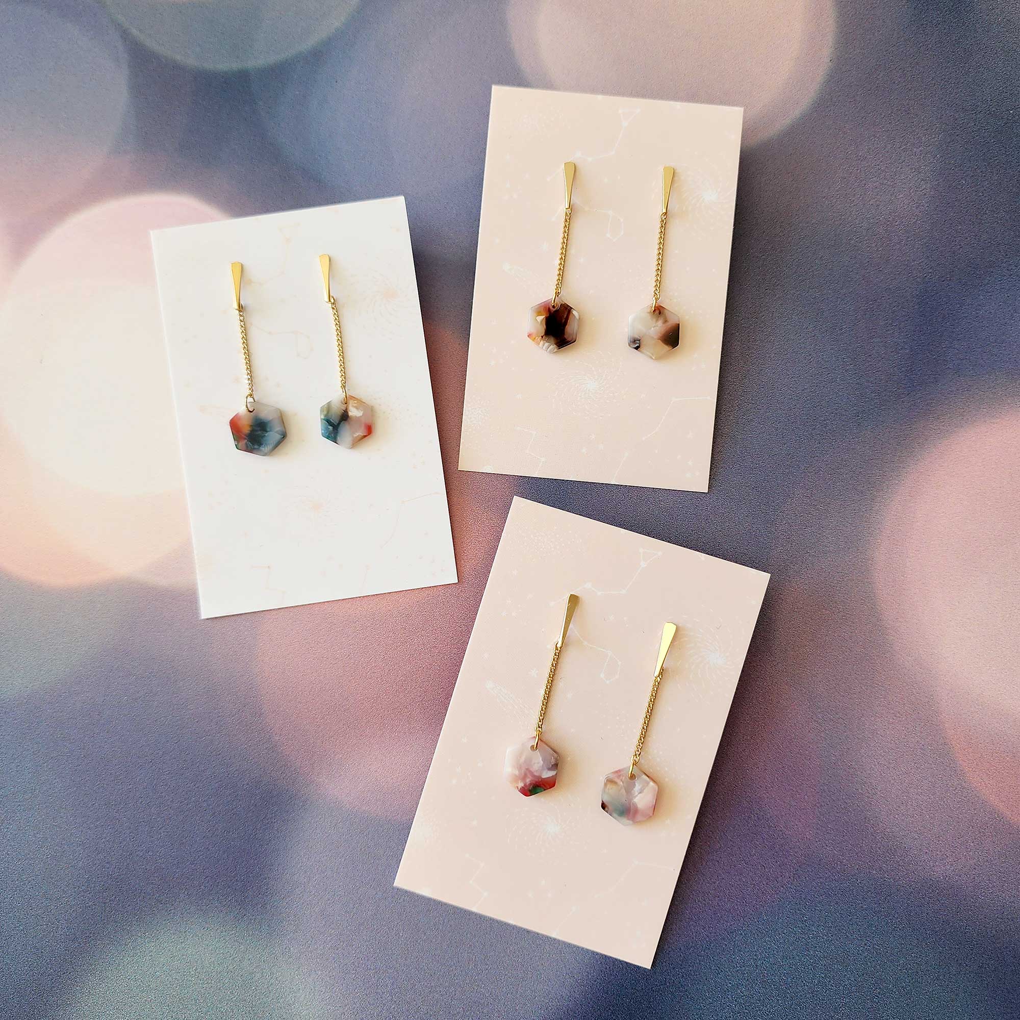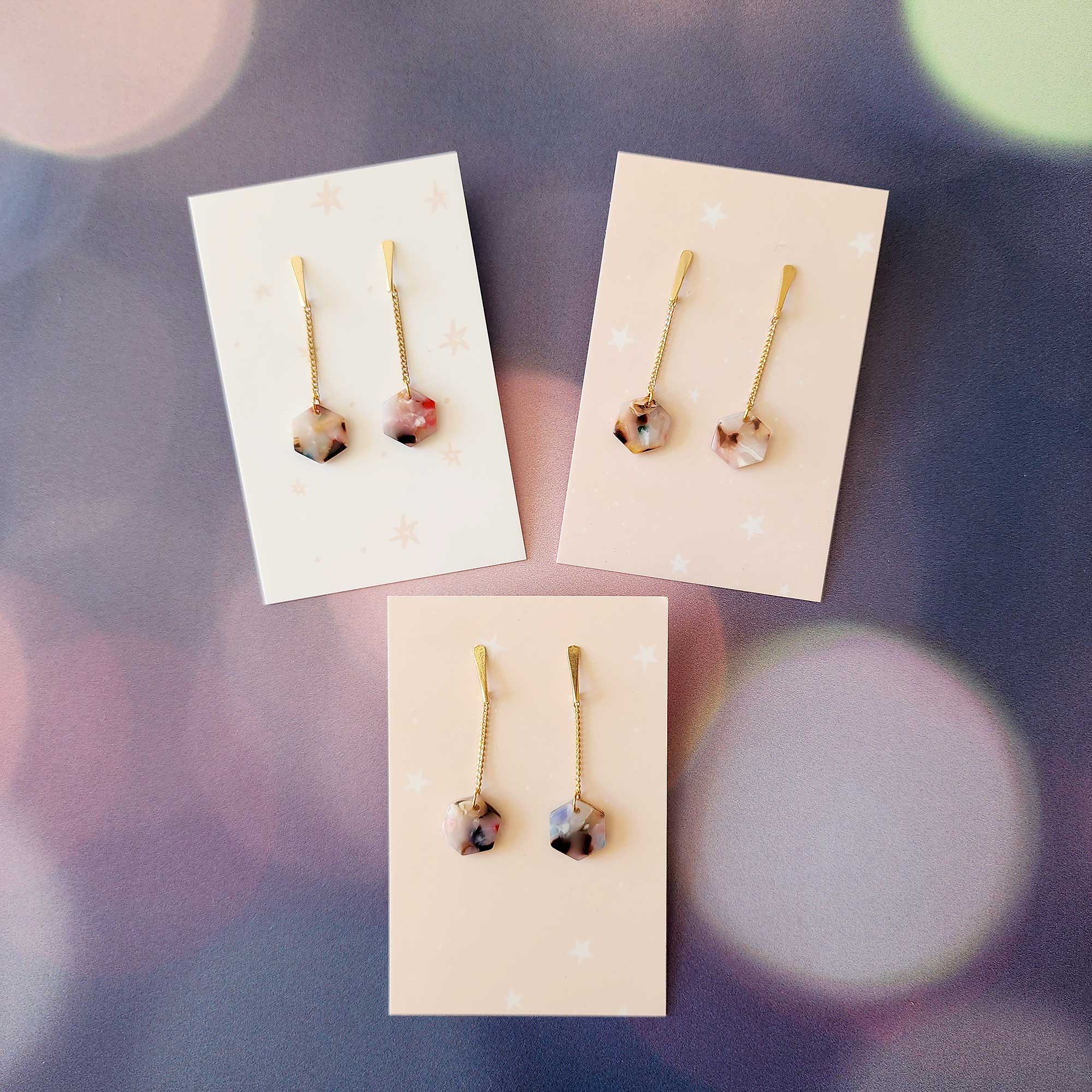 Jolie paire de boucles d'oreilles en laiton plaqué or de haute qualité, ornée de pendentifs en acétate aux tons pastel. Chaînes en laiton plaqué or ultra-fines.
