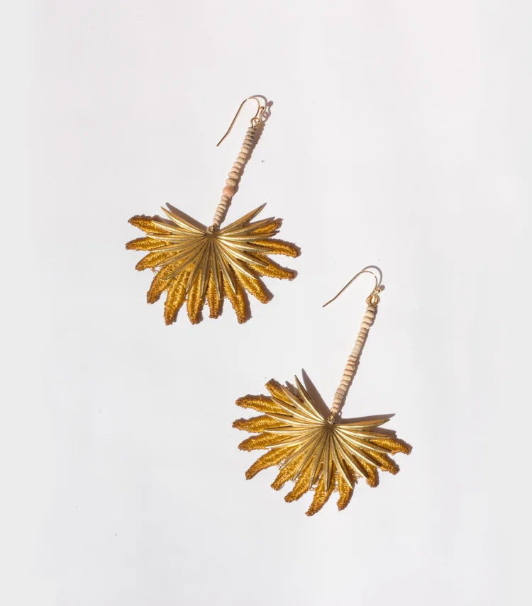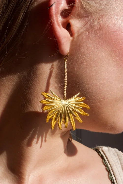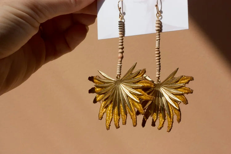 Ces boucles d'oreilles uniques s'inspirent du papyrus, la plante ancestrale utilisée pour fabriquer le papier. Elles sont composées de dentelle vintage de haute qualité (tissage serré), de perles d'argile africaine et de laiton brut, avec des crochets d'oreilles hypoallergéniques plaqués or. La dentelle est teinte à la main dans une palette de couleurs inspirées du monde végétal.