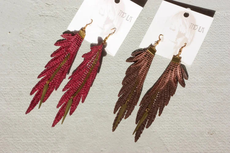 Composées de dentelle teinte à la main avec une chaîne en laiton vintage et d'autres pièces en laiton. Elles sont montées sur des tiges hypo allergéniques en laiton plaqué or sans nickel, avec des supports en caoutchouc.