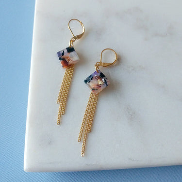 Boucles d'oreilles contemporaines en acétate de cellulose, ornées de pendentifs aux teintes prune, rose, marron, noir et perle. Chaque paire est unique, le motif variant légèrement.