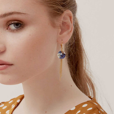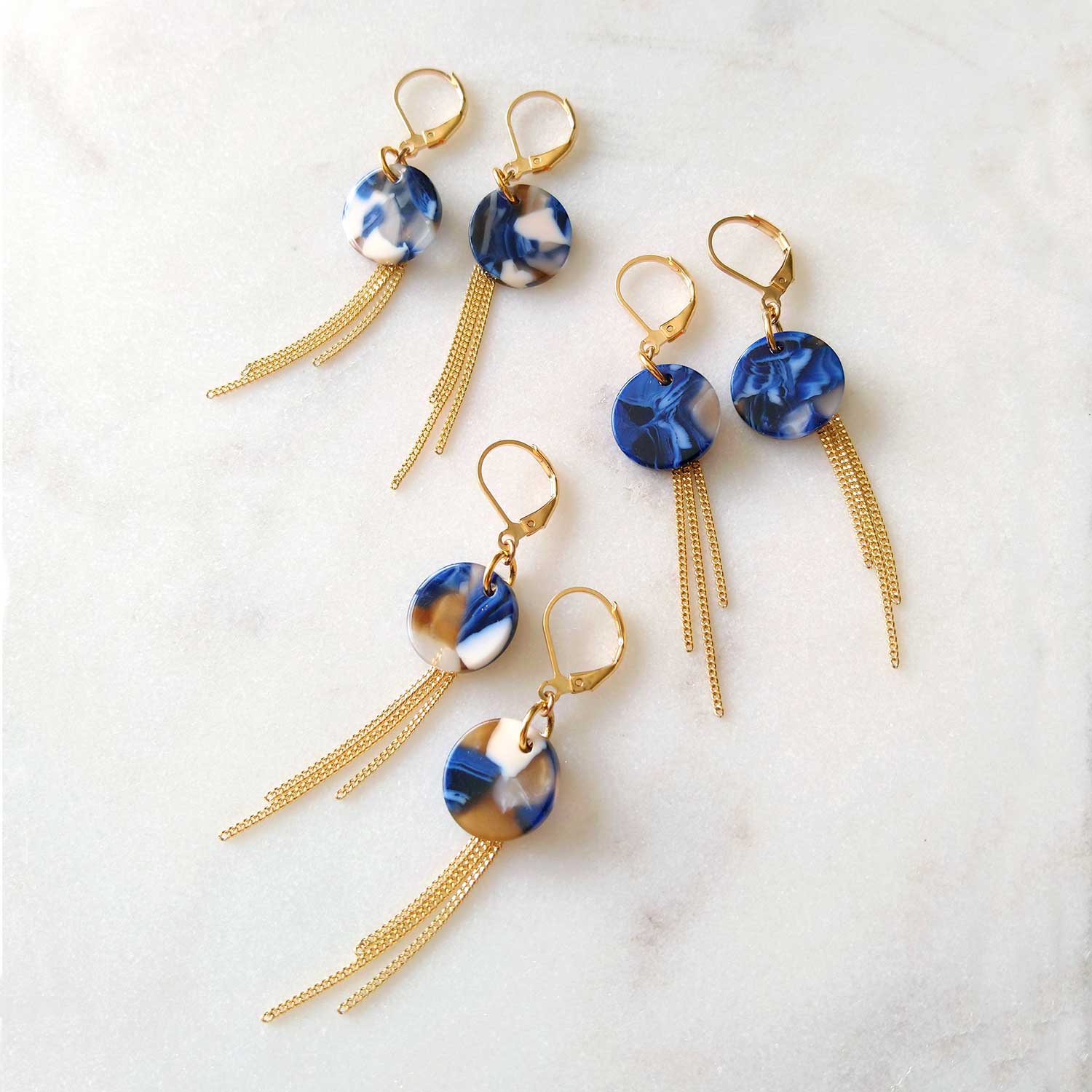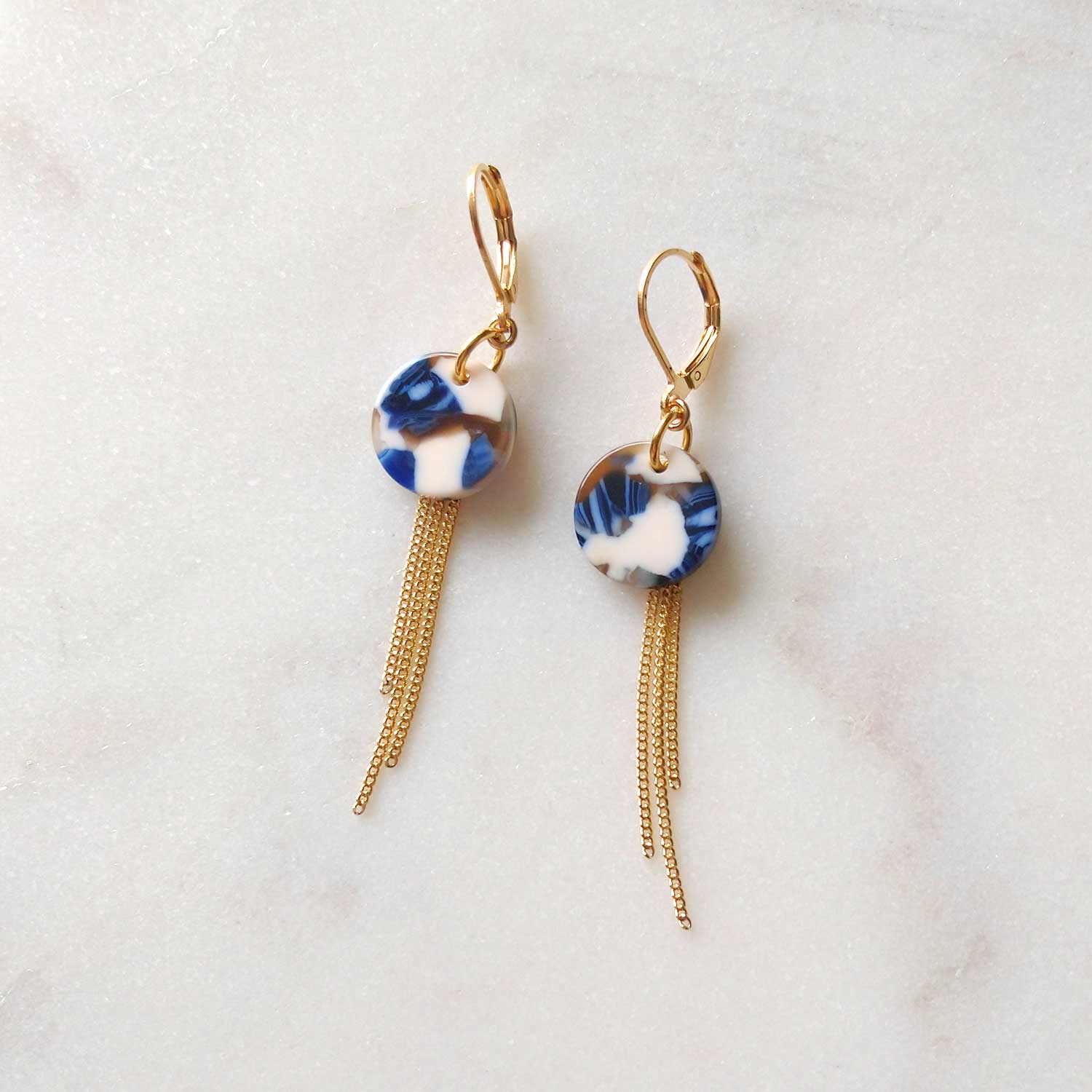 Boucles d'oreilles contemporaines composées de pendentifs en acétate de cellulose aux nuances de bleu, blanc cassé, brun et perle. Chaque paire est unique, le motif variant légèrement (voir photos). Chaînes en laiton plaqué or vintage.