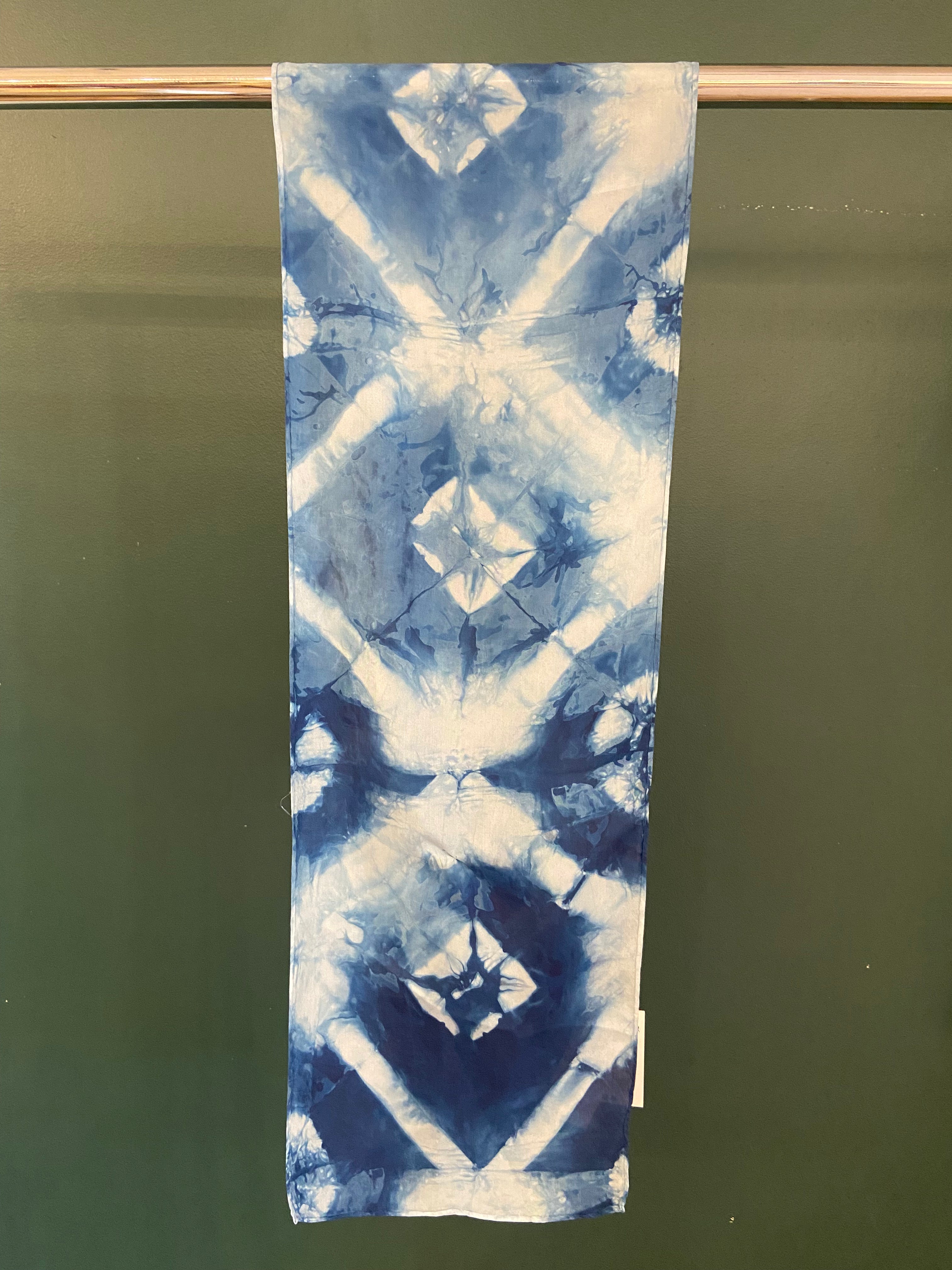 Écharpe de soie teint et imprimé à la main.