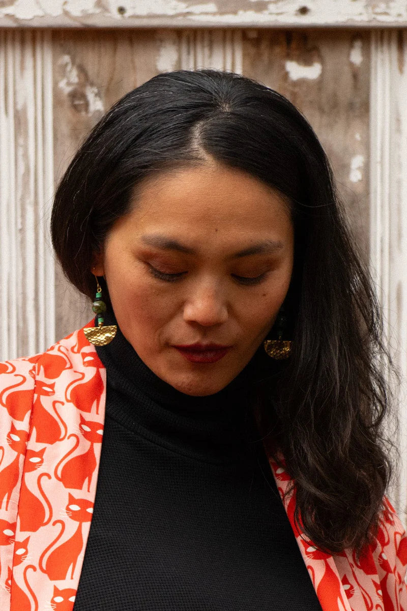 Boucles d'oreilles fait de laiton, de billes artisanales et de pierre semi précieuses.