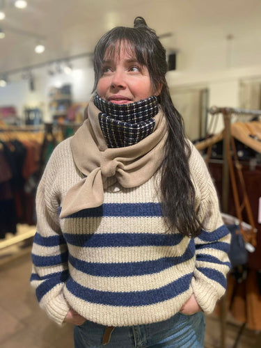 Foulard / châle fait en laine sur l'extérieur avec une découpe de lainage différent à l'avant.