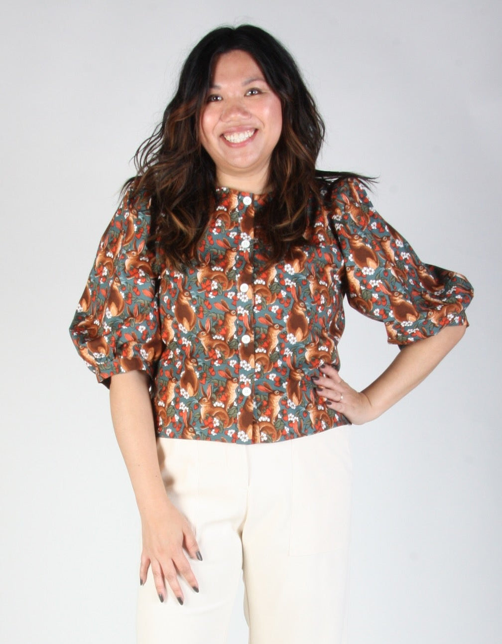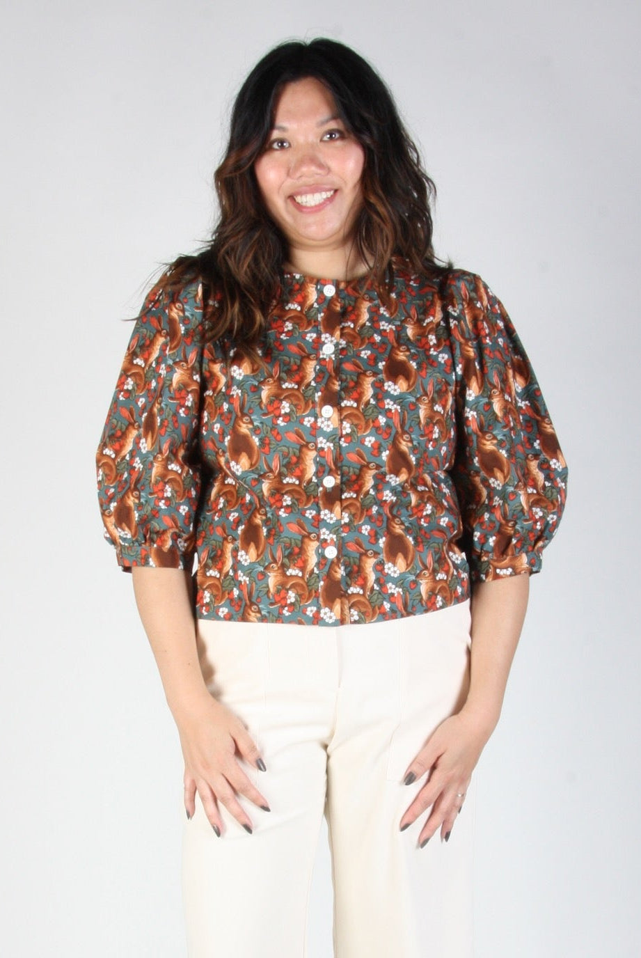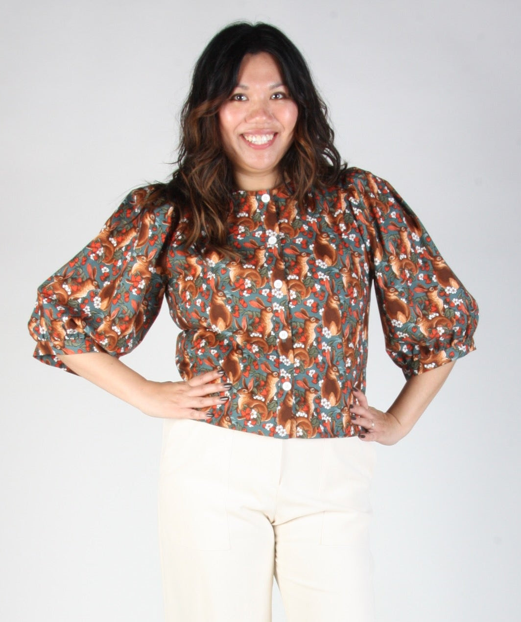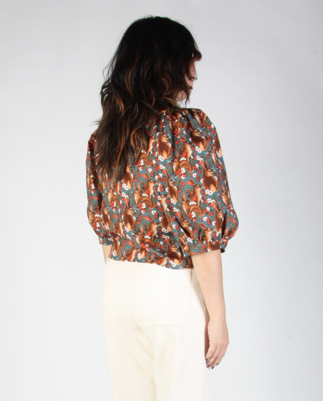 Le modèle Serin est devenu un incontournable chez Birds, apprécié pour ses manches amples et sa coupe décontractée. Son imprimé ravissant met en scène d'adorables lapins bruns, des fraises rouges et des fleurs blanches sur un fond bleu sarcelle profond.