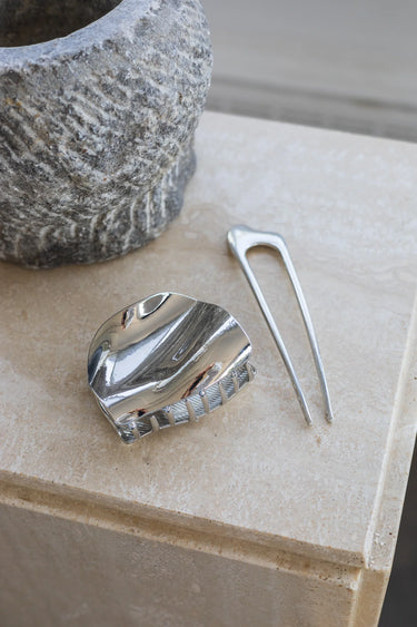Avec ses courbes libres et sa texture lisse, cette pince en métal s’inspire des formes naturelles et sculpturales. Massive mais équilibrée, elle apporte un accent fort à la coiffure tout en maintenant les cheveux en place avec solidité.
