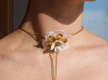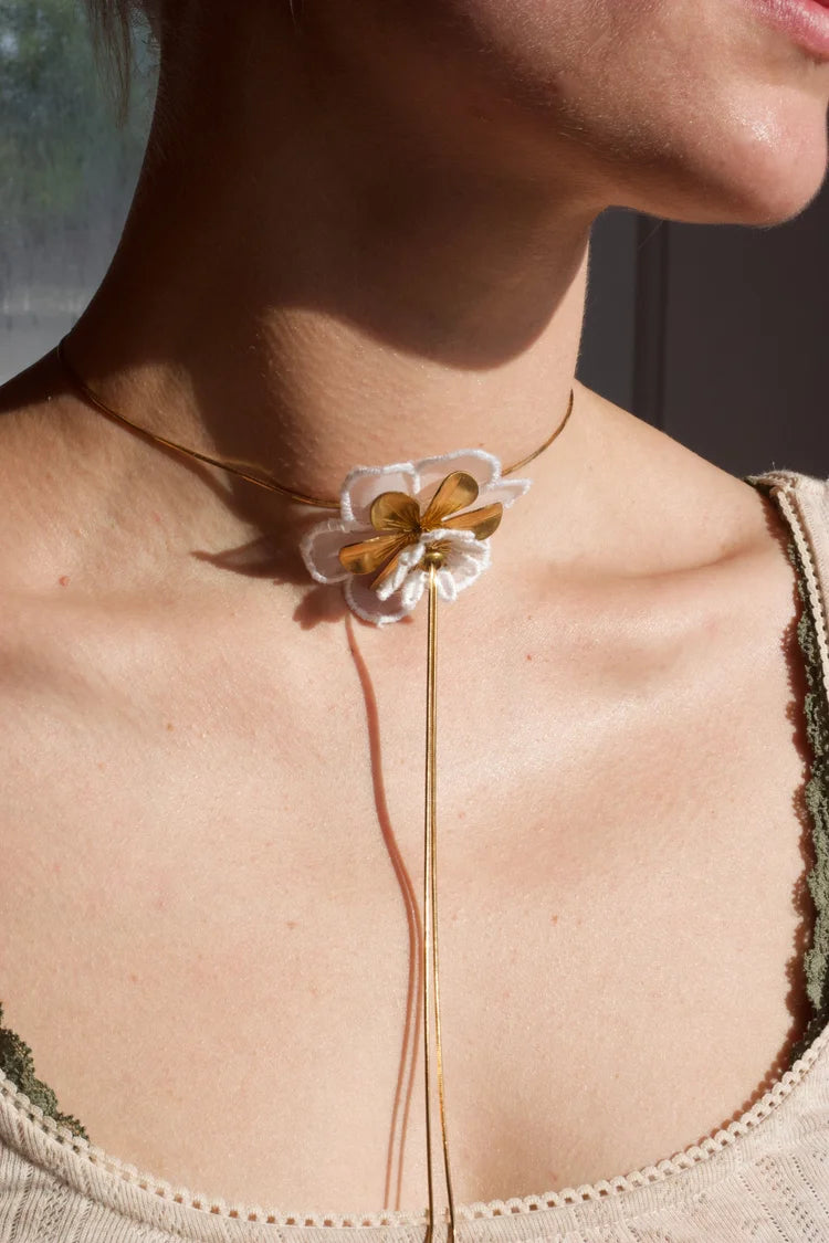Nouvelle interprétation de notre collier Mallow, cette version s'inspire de l'art japonais des fleurs de cerisier. Ce collier bolo se porte ras du cou comme un ras-de-cou, autour et sous le col d'un chemisier ou d'une chemise comme un bolo tie, ou simplement en pendentif. Il peut également servir d'accessoire pour les cheveux et se porte aussi bien autour d'une queue de cheval ou d'un chignon. Il est composé d'appliqués floraux en organza brodé transparent vintage (en quantité très limitée), d'une petite fleur en dentelle vintage teinte à la main et de plusieurs apprêts en laiton brut.