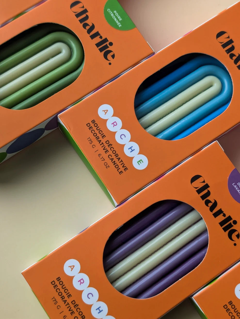 La chandelle Arche 2.0 redessinée pour être encore plus Pop directement inspirée par le Mid-Century et les années 60. Charlie a ajouté une laque sur l'avant de ses bougies pour éviter le glaçage à l'avant et vous permettre de les garder encore plus longtemps.