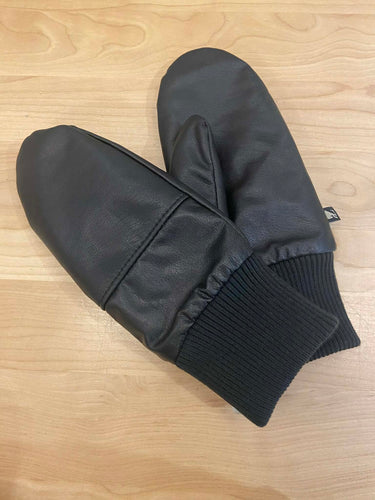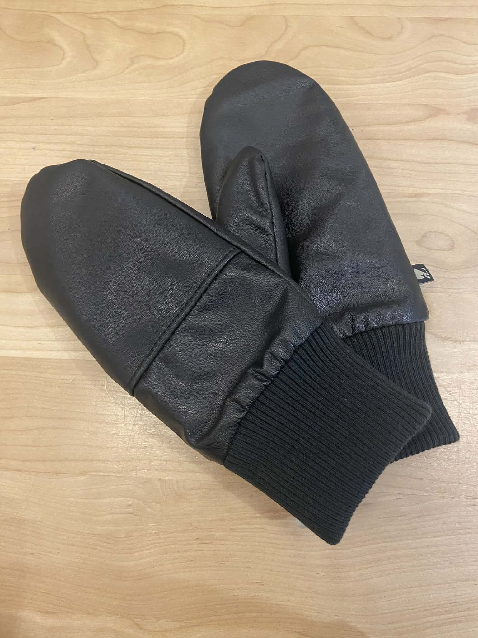 Paire de mitaines faites en cuir recyclé, avec poignets en rib.