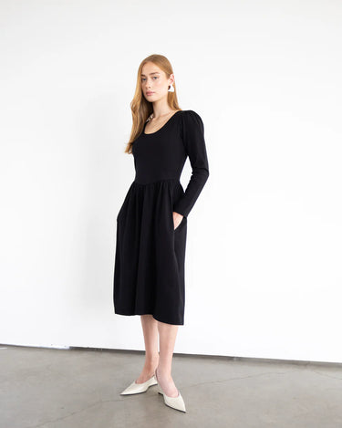 Robe élégante, facile à porter et réversible pour deux looks distincts : d'un côté, une encolure arrondie et décolletée avec une taille plissée en arrondi, de l'autre, un col bateau associé à une taille plissée droite. Elle dispose de poches latérales et sa longueur tombe juste en dessous des genoux.