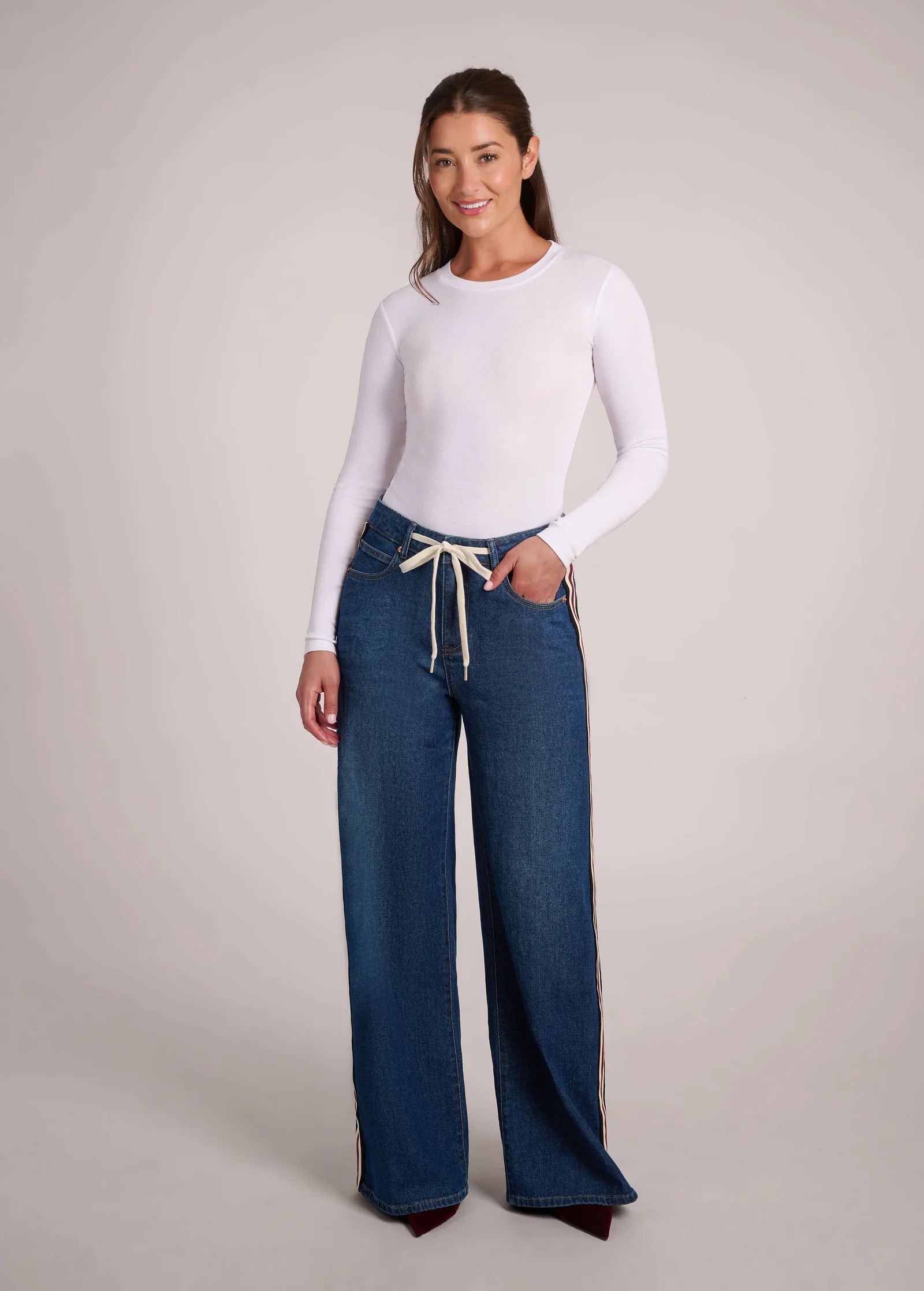 Yoga Jeans a revisité son modèle phare de leur collection Printemps/Été 2025, le Crocus, avec une nouvelle version baptisée Carina. Avec sa coupe large décontractée, ses bandes latérales originales noires, blanches et bordeaux, et sa taille à cordon amovible, ce jean est fait pour bouger. Confectionné dans notre denim appelé poids plume signature, avec une couture d'entrejambe de 32" et un léger effet délavé, il allie confort décontracté et style urbain.