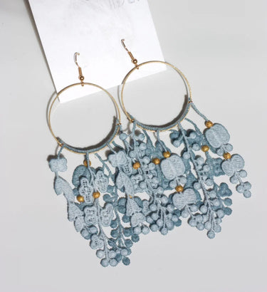 Ces boucles d'oreilles florales à franges sont composées de dentelle teinte à la main et de métaux en laiton brut pur. Une structure en cerceau contient des vignes de fleurs en cascade agrémentées de perles texturées dorées dans une forme qui rappelle un peu celle d'un attrape-rêves.