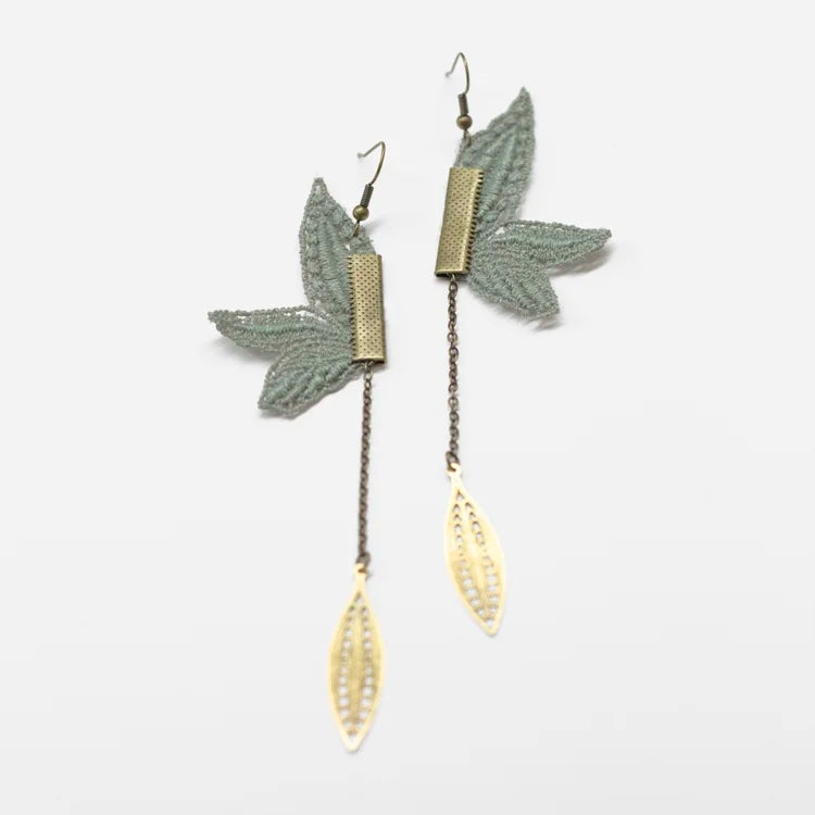 Les boucles d'oreilles pendantes sont composées de dentelle vintage teinte à la main, avec une longue chaîne en bronze, finie avec un pendentif en bronze vintage (la patine peut être visible ajoutant à l'unicité de la pièce). Elles ont des crochets en bronze hypoallergéniques sans nickel, avec des supports en caoutchouc.