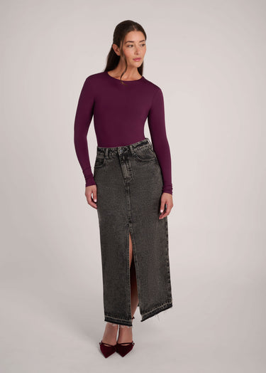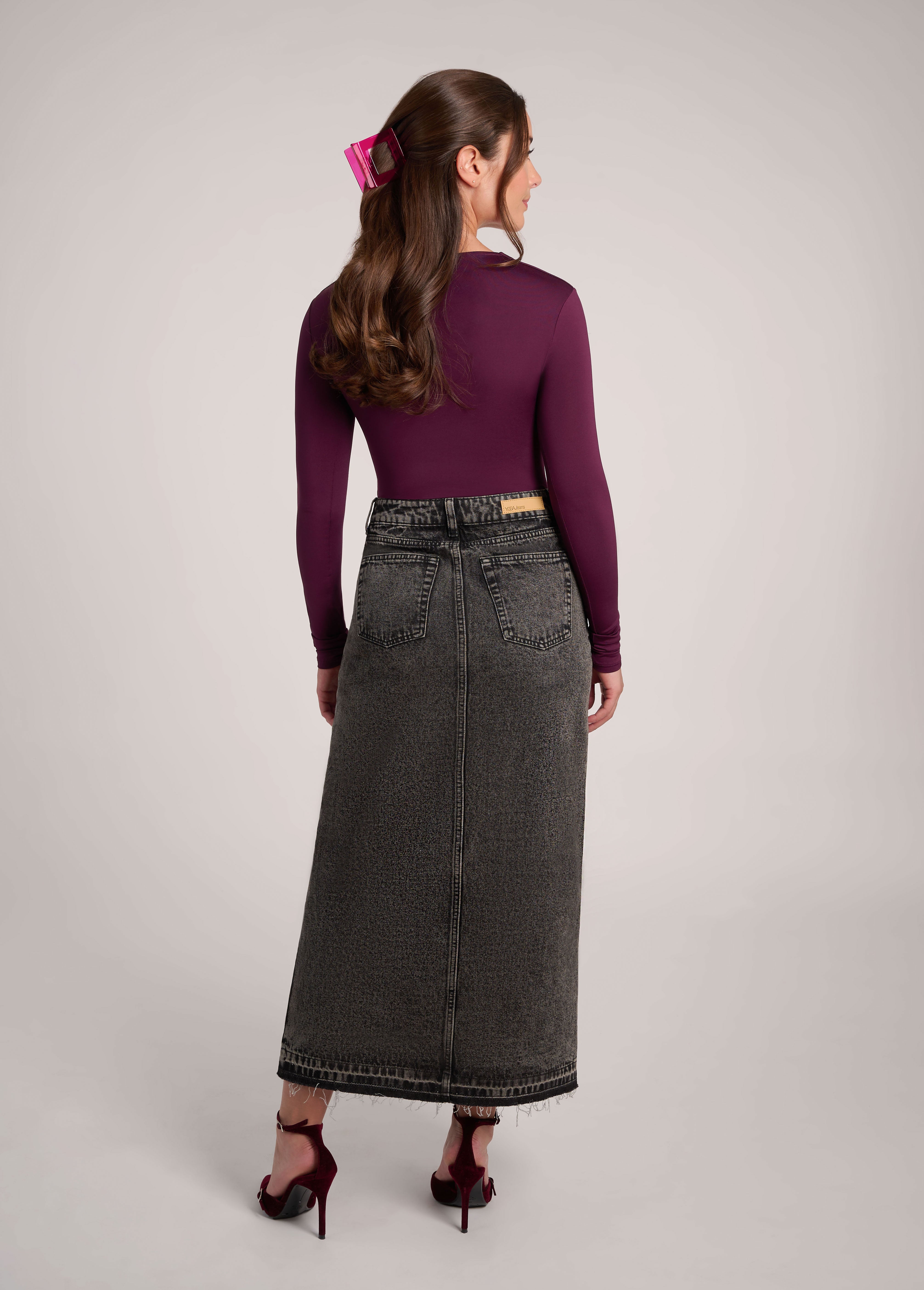 Voici la jupe qui a tout pour plaire. Avec sa coupe trapèze mi-longue flatteuse, sa fente audacieuse sur le devant et son délavage noir acidulé, elle allie à la perfection style décontracté et classique.