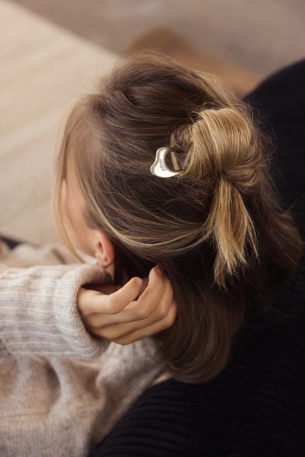 Sa courbe naturelle épouse la forme de la tête pour maintenir les cheveux avec confort et stabilité. Idéale pour créer une demi-couette sur cheveux épais ou pour attacher entièrement la chevelure fine à moyenne, elle apporte une touche brillante et intemporelle à chaque coiffure.