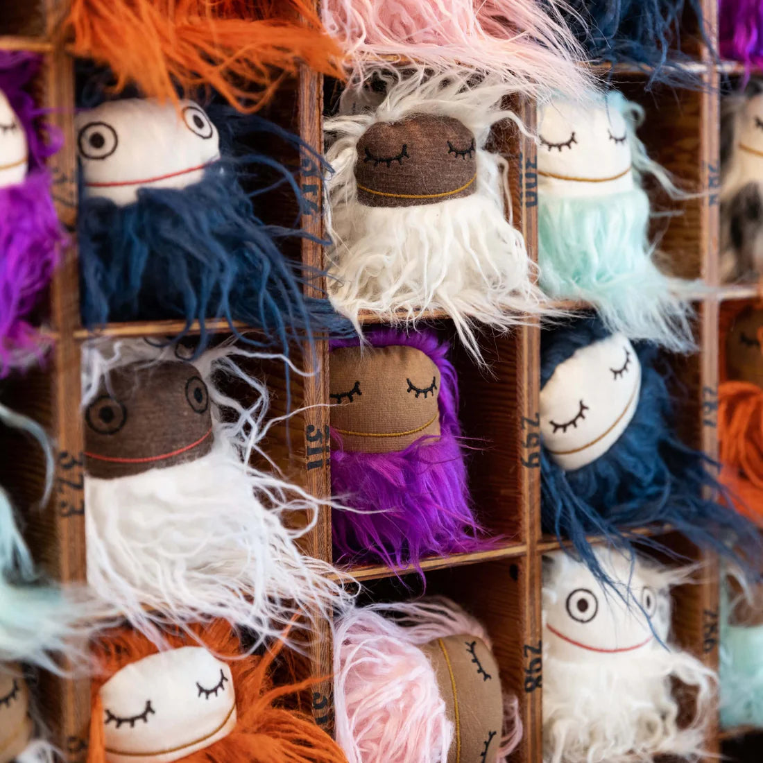 10 cm. Coton, viscose et polyester, rembourrée de fibres de polyester. Visage brodé.