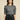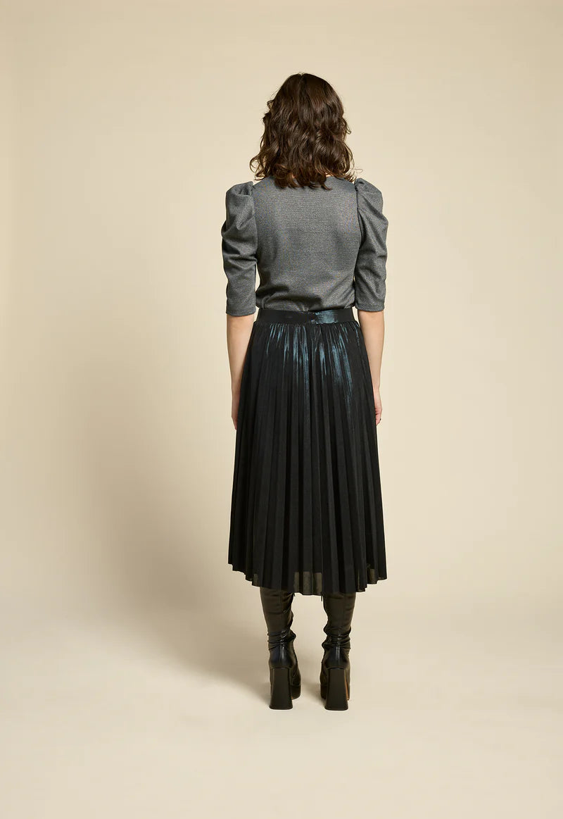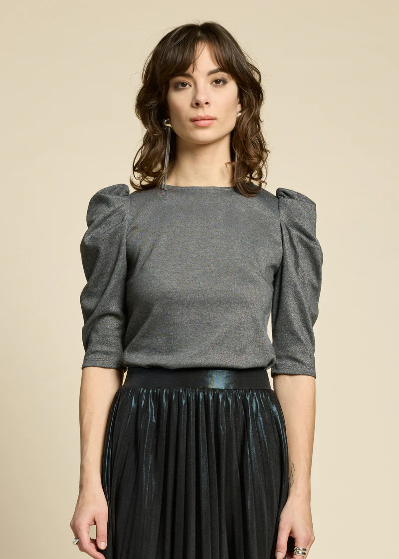 Haut à encolure ronde, réalisé dans un tissu brillant qui a été tricoté à Montréal . On aime ses manches bouffantes qui apportent un joli volume à la silhouette.