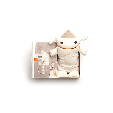 100% jersey de coton biologique (tricoté au Canada), rembourré de fibres de polyester. Yeux, bouche et cœur brodés à Montréal. Maison de carton décorée par Isabelle Arsenault, illustratrice québécoise.