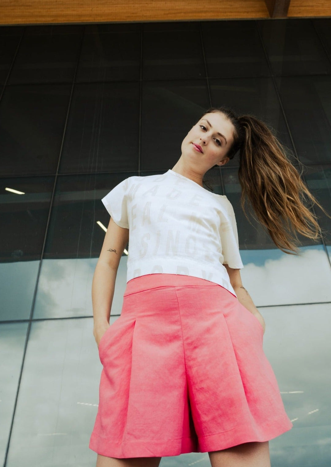 Shorts à taille haute et coupe évasée. Plis à l'avant. Fermeture éclair invisible et poches sur les côtés. Longueur mi-cuisse. Poche à l'arrière.